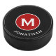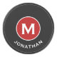 Minimal monogrammed design features a red monogram emblem on a black background with your personalised initial and name in a white classic block typography. Personalise with your initial.