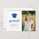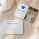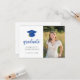 This graduation invitation features a simple black-and-white theme with a blue cap and gold tassel. Add a photo and customise text on the front and back to include all details for your graduation party.