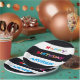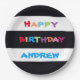 Happy Birthday Any Age Cute Colourful Modern Personalised Paper Plates. Customise with your own name. The bright and upbeat "Simple Bright Colourful Custom Name Happy Birthday Paper Plates" Words are printed on classic Black and White Striped background. Fast Worldwide shipping. 30 Day Money Back Guarantee. Proudly made in the U.S.A!