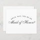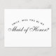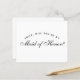A simple, minimalist maid of honour proposal: just black text on white background. The words Maid of Honour on the front and the message on the back are written in an elegant calligraphic script, the arched text "[Name] will you be my" in small caps.