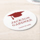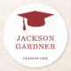 Classic graduation paper coaster featuring a simple and minimalist design with a grad cap along with the graduate's name and class year in bold dark red over a white background. A traditional design with a masculine touch perfect for a boy graduate. These paper coasters are a great way to add a personal touch to your graduation party.