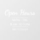 Business and Open Hours Company Window Cling Sign. Elegant Serif Fonts. Large type for easy reading. Easy to personalise for your own company needs.