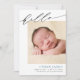 Share your joyful news with this simple, modern birth announcement. The card features pretty script that reads "hello" across the top. Below the calligraphy, add your newborn's photo, name, birth stats, and your names. The baby's name is written in blue but this can be easily changed if you prefer another colour. The background colour on the back of the card is editable (shown as blue); you can also add additional photos and a custom message on the back if you'd like.