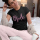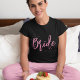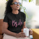 This design features bride wedding pink calligraphy script, chic modern elegant simple, a minimal minimalist dots fun, bridal shower bachelorette party gift, great for bachelorette weekend event celebration, for her feminine ladies girly, trendy stylish cute typography, minimal classic clean simplistic, simple graphic novelty keepsake, for the bride t-shirt