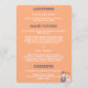 The menu on the back, on an orange background is separated in three sections with customisable titles and content, you can modify, remove or add more sections if you want.