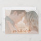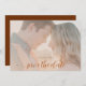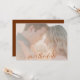 A soft blush overlay makes this simple, modern and effortlessly chic wedding photo save the date a nice choice for a fall wedding or for any couple with blush, soft pink, monochromatic beige or dusty pink colour schemes. A rust brown background on the back provides a nice contrast for the design.