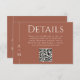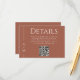Simple, elegant and tasteful, this classic terracotta wedding Details enclosure card features a thin line border along the left edge with the bride and groom's monogram initial. A timeless elegant serif font conveys your information beautifully. The earthy terracotta background with off-white text is a popular choice for fall weddings and adds to the clean simplicity of this design. A QR code is included in the template to personalise with your wedding website URL. Guests can scan the QR code or visit the URL shown to view information surrounding your wedding as well as RSVP online quickly and easily.