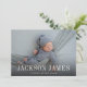 A simple and timeless birth announcement design featuring a full bleed horizontal or landscape orientated photo with baby's name and birth stats overlaid along the bottom in classic white lettering. Add three additional square photos to the back, along with a personal message.