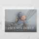 A simple and timeless birth announcement design featuring a full bleed horizontal or landscape orientated photo with baby's name and birth stats overlaid along the bottom in classic white lettering. Add three additional square photos to the back, along with a personal message.