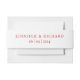 This classic belly band has a simple design featuring a modern red script with customisable names of the bride and groom and the wedding date, all on a stylish white background.
