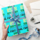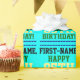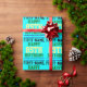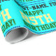 This plain birthday wrapping paper design features a message like "First-Name, happy 85th birthday!", where the name and birthday number can be customised. It also features decorative oval shapes. The background is coloured cyan. Wrapping paper like this could perhaps be used to wrap presents being given to celebrate somebody’s birthday. [~Z0000243]