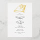Simple Seashells in gold foil with calligraphy and classic fonts on simple front invitation. Reverses to watercolor sandy beach texture with earthy brown tones. This version has a conch shell at the top.