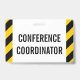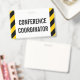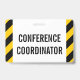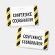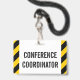 This simple badge design features the message "CONFERENCE COORDINATOR". It also features black and yellow coloured warning stripes. [~Z0000286]