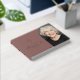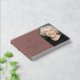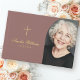 Memorial funeral guestbook featuring a photo inside an half arch and a simple Christian cross.