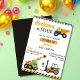 Construct an unforgettable birthday bash with this engaging construction-themed invitation! Perfect for any young builder turning seven, this invitation features a bold number "7" paired with a cheerful dump truck illustration, setting a playful tone for the celebration. The birthday child's name is highlighted in an eye-catching font and the party details are clearly laid out, with the date and time emphasized in striking orange and black. A festive construction tape pattern lines the bottom, ensuring all the essential information stands out. Additional construction vehicles, such as a crane and a forklift, are illustrated at the bottom, enhancing the theme. The subtle background details, like a tire tread pattern at the top, further tie in the construction theme without overwhelming the main elements. The back of the invitation is solid black, providing a sleek and polished finish that complements the vibrant front design. Ideal for young construction enthusiasts, this invitation will set the stage for a birthday party filled with adventure and fun. Order now to ensure your child's birthday is a construction-themed celebration to remember! Thank you for stopping by. If you have any doubts regarding customisation pls message me here or contact me at arteartz0588@gmail.com.