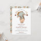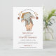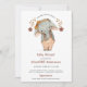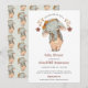 An adorable watercolor elephant baby shower invitation sporting a cute baby elephant in overalls with hair bow, in hues of sage and orange watercolor. The type is a unique decorative font with swashes. The elephant pattern is carried over to the back of the invite.