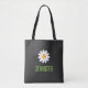 This modern tote bag features a simple white daisy with a yellow centre and a personalised name in green text. This minimalist design will make a great gift for family, friends, coworkers, sports teams, and more. Customise the text to fit your needs.