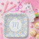 Cute Customisable Initial Name Simple Light Blue and White Paper Plate for any occasion for Floral Calm Cool and Simple Theme Party