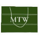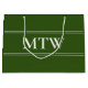This forest green gift bag has white text. You can edit it to show the correct monogram. White lines are above and below the text.