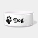This pet bowl features a simple black paw print silhouette with a customisable text area next to it that now reads a sample text "Dog". The sample text can easily be replaced with the name of your pet, for example.