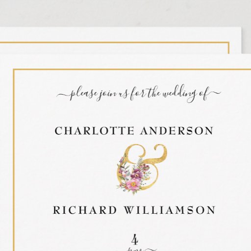 Simple but elegant, wedding couple's names along with a gold ampersand and pink floral arrangement.
