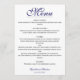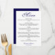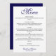This wedding menu is simple yet elegant and classy. It features fancy navy blue coloured script lettering on a white background with the word "Menu" at the top, and the names of the couple and wedding date below. The back is a lush marbled navy bluecolor. Perfect for adding a touch of class to your wedding reception.