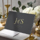 This wedding with gold swirl ampersand and beautiful, charcoal grey background, creates an elegant, romantic vibe, giving just a hint of what guests can expect on your big day. This minimalist guest book design provides a template to easily add both your initials, wedding location and date in gold on a dark charcoal background. Search ID1022 to see all the products in this wedding suite.