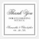 These wedding thank you stickers are simple, classic, timeless and beautiful The design features a classic black and white design with a white background, a double border and elegant script lettering reading: Thank You for celebrating with us. There is space for the couple's names and the wedding date.