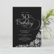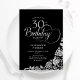 Simple elegant 30th birthday party invitation in black and silver. Classy design featuring roses, faux silver foil and typography script font. Trendy invite card perfect for a stylish female bday celebration. Personalise with your own details. Can be customised to any age. Printed Zazzle invitations or instant download digital printable template.