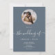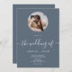 Simple elegant dusty blue white photo script wedding invitation with this classic and elegant calligraphy the wedding of Script in dusty blue and white Add you couple's photo in a circle mask.