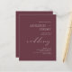 This simple, elegant wedding invitation features the word "wedding" in stylish white script. Personalise it with the names of the bride and groom in white serif capital letters (joined by the word "and" in script that matches "wedding") and the remaining text in lowercase white italics on a burgundy background.