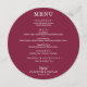 A round dinner menu card on cranberry (or any colour) and chic lettering in white displays your menu choices. Perfect for a holiday Christmas party or any special event with a sit down dinner menu. Choose ANY COLOR BACKGROUND, any COLOR TEXT, any FONT! Easily personalise with your dinner menu and details.