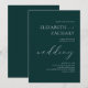 This simple, elegant wedding invitation features the word "wedding" in stylish white script. Personalise it with the names of the bride and groom in white serif capital letters (joined by the word "and" in script that matches "wedding") and the remaining text in lowercase white italics on a dark green background.