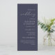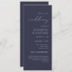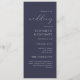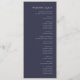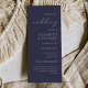 This simple, elegant wedding program features white text aligned with the right margin on a dark navy blue background. The word "wedding" appears in white handwriting calligraphy, with the remaining text in serif and italic fonts.