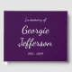 This simple and elegant funeral or memorial guestbook features a dark purple background, along with text in white script. It features a personalised name, birth/death years, and a customised message.