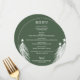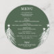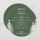 A round dinner menu card on evergreen with white Christmas trees and your menu details in chic lettering. Perfect for a holiday Christmas party or any special event with a sit down dinner.