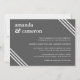 A simple and elegant wedding invitation in medium charcoal grey with white triple lined corners and white text. The bride and groom's names feature prominently on the upper left of the invitation with the details of the wedding in a modern right-justified layout. This tasteful invitation is a wonderful choice for weddings in any season of the year or any time of day. The luxurious colour scheme sets the tone for a lovely wedding celebration. You can change the colour of this invitation to match your wedding colour scheme by choosing "click to customise further" at the bottom of the text template and selecting a different background colour.