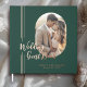 A uniquely elegant wedding guest book with real rose gold foil and modern styling on a popular emerald green background. The design features an oval photo template for including your selected photo. Wedding Guest Book text is spelled out in modern script typography and is accented with simple line graphics. Personalise the text template with your names and wedding date. The spine of this guest book also has a text template to personalise as you like. You can choose between 3 shades of gold foil: rose gold (shown here); gold, or silver.