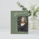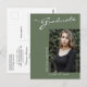 This modern elegant yet simple graduation announcement postcard, features design elements of modern text fused with elegant calligraphy script. The graduates single photo highlights the front of the card while the back of the card offers personalised text spaces for information about the graduation and future journey. White writing on stylish sage green or easily customise the background to a colour of your choice. To see more items like this, visit my store here at "www.Zazzle.com/LakeViewCardCo". Thanks