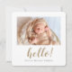 This simply stylish photo birth announcement square flat card features a contemporary look that is equally well suited to girls and boys. We've picked rounded corners as the default shape setting, but you can easily change the look to sharp corners, as that look also works wonderfully with this design. Beneath your photo we've added a simple 'hello!' in all lower case in a relaxed, modern script. We've highlighted it by making it an elegant gold tone that's sometimes called California Gold. This element of the design can't be altered. The name on the front below that is in dark grey, but when you edit our sample text to show your baby's name, you can easily also change that text colour and font to suit your style. We've set the background on both sides as transparent, to let the colour of your paper simply serve as the base tone. You can change this on one or both sides by choosing a colour instead. On back, We've included a place for your baby's full name again, also in the gold tone we used for 'hello!' on the front. When you edit this to show your baby's name, you might decide to change the colour of this text. The stats below that are set as grey, but you can also change the colour and font of this. Finally, at the bottom on back, we've added a line in script with a message of welcome and your names. This can also be edited for colour and font to suit your style, and of course you can change the wording as well. In any case, please do remember to remove all of the placeholder and sample text on both sides as well as our sample photo! The default paper type, matte, has a soft warmth to it and resists smudging, so it's a great choice for writing your own message if you choose to delete some or all of our sample text on back without replacing it with your own. Or you can change the paper type to semi-gloss or one of zazzle's other lovely styles. Use the intuitive design tools, your favourite photo and your inspiration to personalise this custom birth announcement square flat card and make it uniquely yours!
