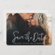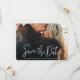 We also offer postcard and magnetic card versions of this design in our shop, so please browse our selection! This simple, stylish modern photo wedding save the date flat card template features 'Save the Date' in a lively modern script with your first names, date and wedding locale on a single line below it. The text is a crisp white. We've made the default shape rounded corners, but you can of course change that and choose sharp corners instead. On the back we chose an atypical order for the information, putting the 'Save the Date' text after the 'for the wedding of' text, which lends a path less traveled charm to it. You can easily alter this order or change anything else to suit your needs. On back, we've picked a tone called White Smoke that's a very light gray, with mostly white in it. You can easily change this by either picking one of the basic colors in the editing tools or entering a color number if you have a specific hue in mind that you found in your research, or by looking at the color spectrum tool and choosing something by sight. The default text tone on back is gray, but you can edit this in favor of another text color, and you can also change any of the font. Use the intuitive editing and design tools, your favorite photo and your inspiration to make this simply chic photo wedding save the date card uniquely yours!