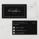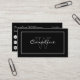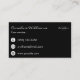 A business card in a simple and elegant design in white on black with a name and monogram in a rectangle on the front and contact information on the back.