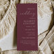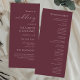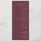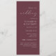 This simple, elegant wedding program features white text aligned with the right margin on a dark burgundy red background. The word "wedding" appears in white handwriting calligraphy, with the remaining text in serif and italic fonts.