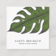 Tropical square business card featuring a simple and modern design with a large green palm leaf along with your name and title, over a white background. The backside has your contact information in white over a matching shade of green.