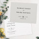 This simple, elegant wedding save the date postcard has a timeless, minimalist design. The default setting for the text color on the front is black, and the default background color is related to light gray tones. You might prefer to change the base to white or another hue of your choice. You can do this by simply picking one of the basic colors by sight in the editing tools, or you might prefer to add a specific hex color number that you have found in your research. The base on the back of the postcard is set to simply be the color of the paper, as we have chosen to use a clear base with the sample text. We have not chosen any color. Take note however that if you choose to keep the ampersand symbol on the back between your names, that symbol style and color cannot be changed. You can add a color of your choice to the back as the base, be it white or something else, and/or change the base color on the front, according to your taste. You might want to make them both the same color of your choosing, perhaps white or something similar or another, totally different hue. Or you might prefer a different base tone for each side. You can also delete the 'postcard' text on the back if you prefer a simpler look.
