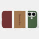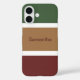 Modern, simple and stylish personalised cell phone case with a fall colour scheme pattern. Large green, tan and maroon stripes with small white stripes. Your name printed in a maroon text.