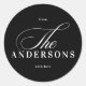 Black and white. This is a simple minimalistic Round Sticker with your Family Name for Christmas gifting and decoration. 'The' is large in calligraphy to place with your editable name in any available font. holidayz18
