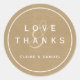Rustic and simple wedding thank you sticker on a faux brown kraft paper background with love & thanks white script.