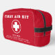 Elevate your safety withthis simple, modern red and white first aid Dopp kit, a compact lifesaver for emergencies. Personalise your name and medical information on the front for easy identification. On the reverse, find a detailed list of included essentials such as bandages, antiseptic wipes, and medications, all labelled for quick access. Embellished with a prominent red and white cross, this kit stands out for its functionality and style. Designed for versatility and peace of mind, it's your go-to companion for every journey.