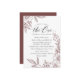 This beautiful wedding invitation features stylish typography, reading, "I have found the One whom my soul loves" (from Song of Solomon 3:4). A detailed floral design in cinnamon red adorns the upper left and bottom right corners, creating a stylish frame around the text. A simple colour scheme of white, cinnamon red, and muted black give these invitations a delicate, yet modern feel. Simply customise the text for your special day! For design or product enquiries, please feel free to contact me (Tracey) at orabellaprints@outlook.com.